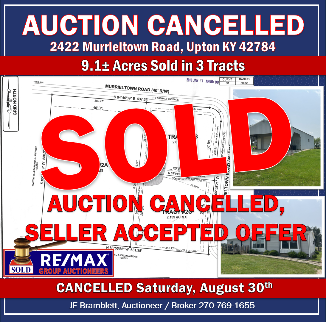 Jun 16 Love1 Auction | 9.1± Acres Sold in 3 Tracts in Upton | Aug 30th, 2025 10:00am CDT By Bramblett JE Past Auctions, Past Auctions | Farm & Land, Past Auctions | Residential CANCELLED Auction 9.1± Acres Sold in 3 Tracts 2422 Murrieltown Road, Upton KY 42784 RE/MAX Group Auctioneers is presenting an...Read More