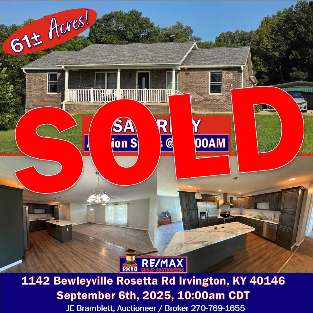 Jun 16 Love0 Auction | 61± Acres Sold in 3 Tracts in Irvington | September 6th, 2025 10:00am CDT By Bramblett JE Past Auctions, Past Auctions | Farm & Land, Past Auctions | Residential Auction 61± Acres Sold in 3 Tracts 1142 Bewleyville Rosetta Road Irvington, KY 40146 September 6th, 2025 10:00am CDT RE/MAX...Read More