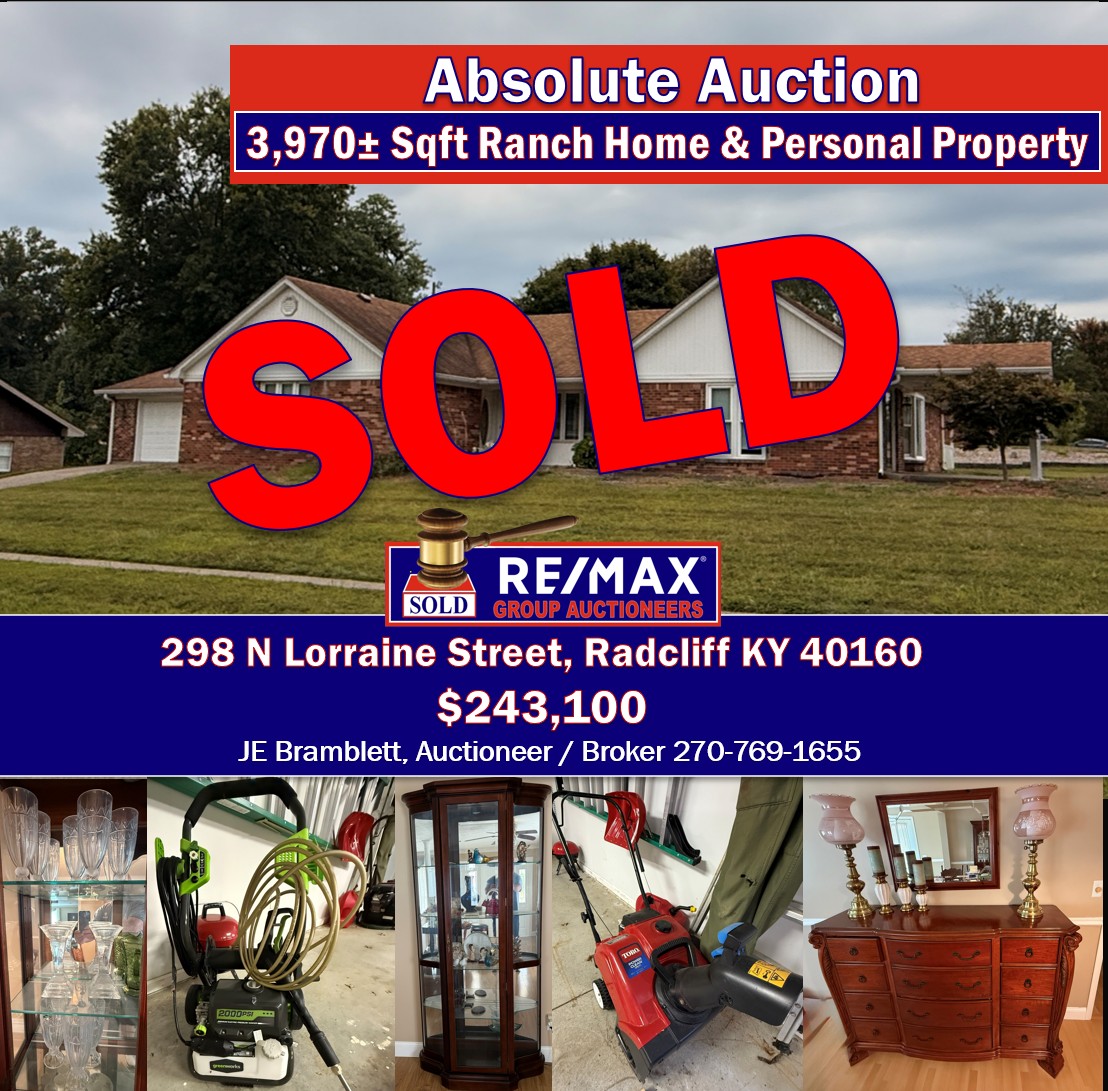 Oct 09 Love1 Absolute Auction | 3,970± Sqft Ranch Home & Personal Property in Radcliff KY | October 18th, 2025 10:00AM EDT By Bramblett JE Past Auctions, Past Auctions | Equipment/Furniture, Past Auctions | Estate/Liquidation, Past Auctions | Residential Absolute Auction On-Site 3,970± Sqft Ranch Home & Personal Property 298 N Lorraine Street Radcliff KY 40160 October 18th, 2025...Read More