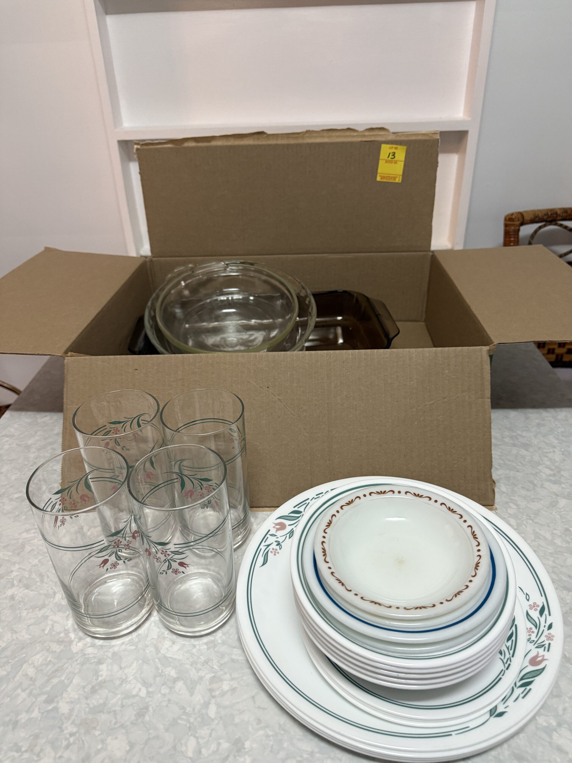 LOT 13. BOX LOT OF DISHES AND PYREX
