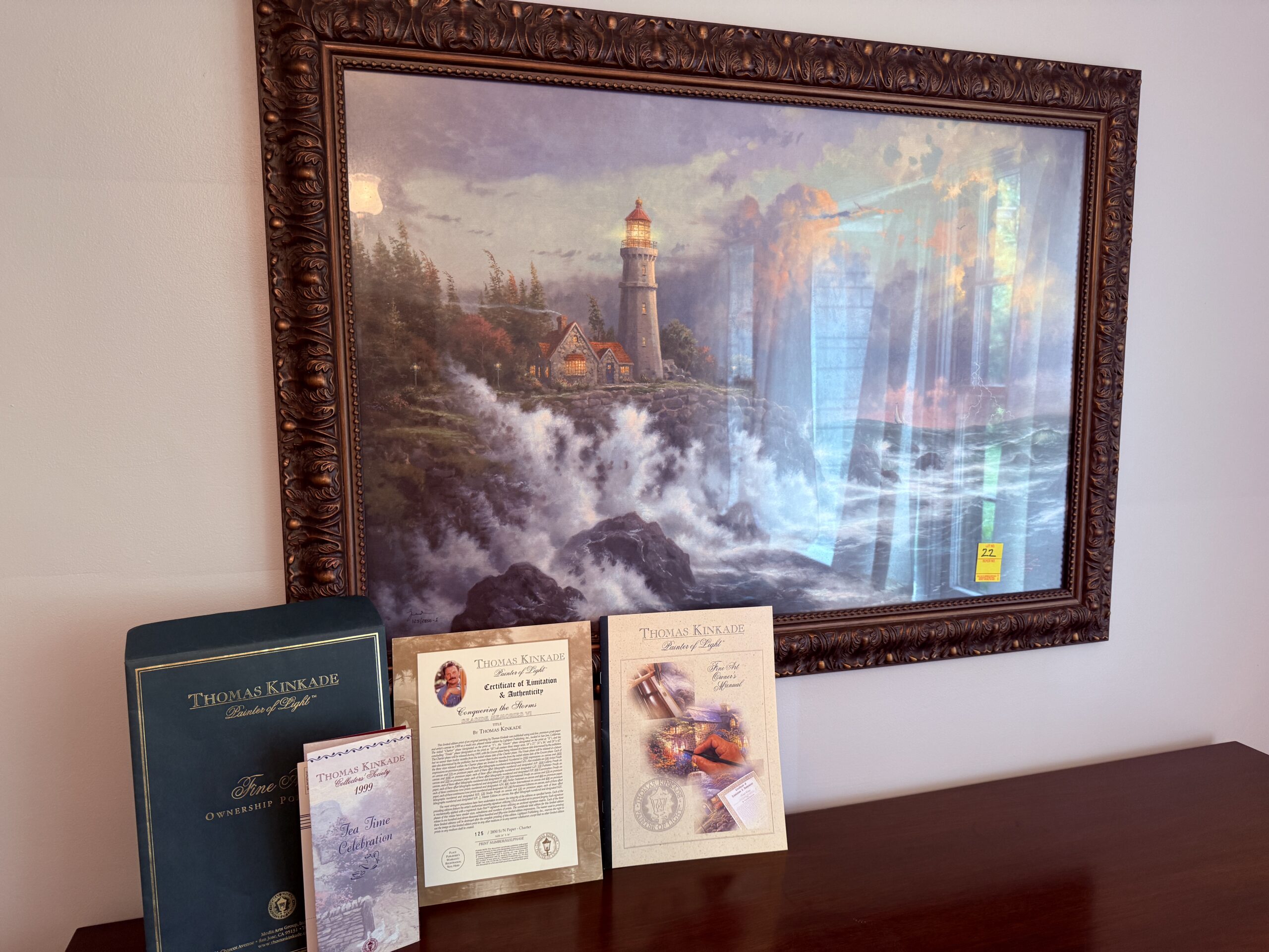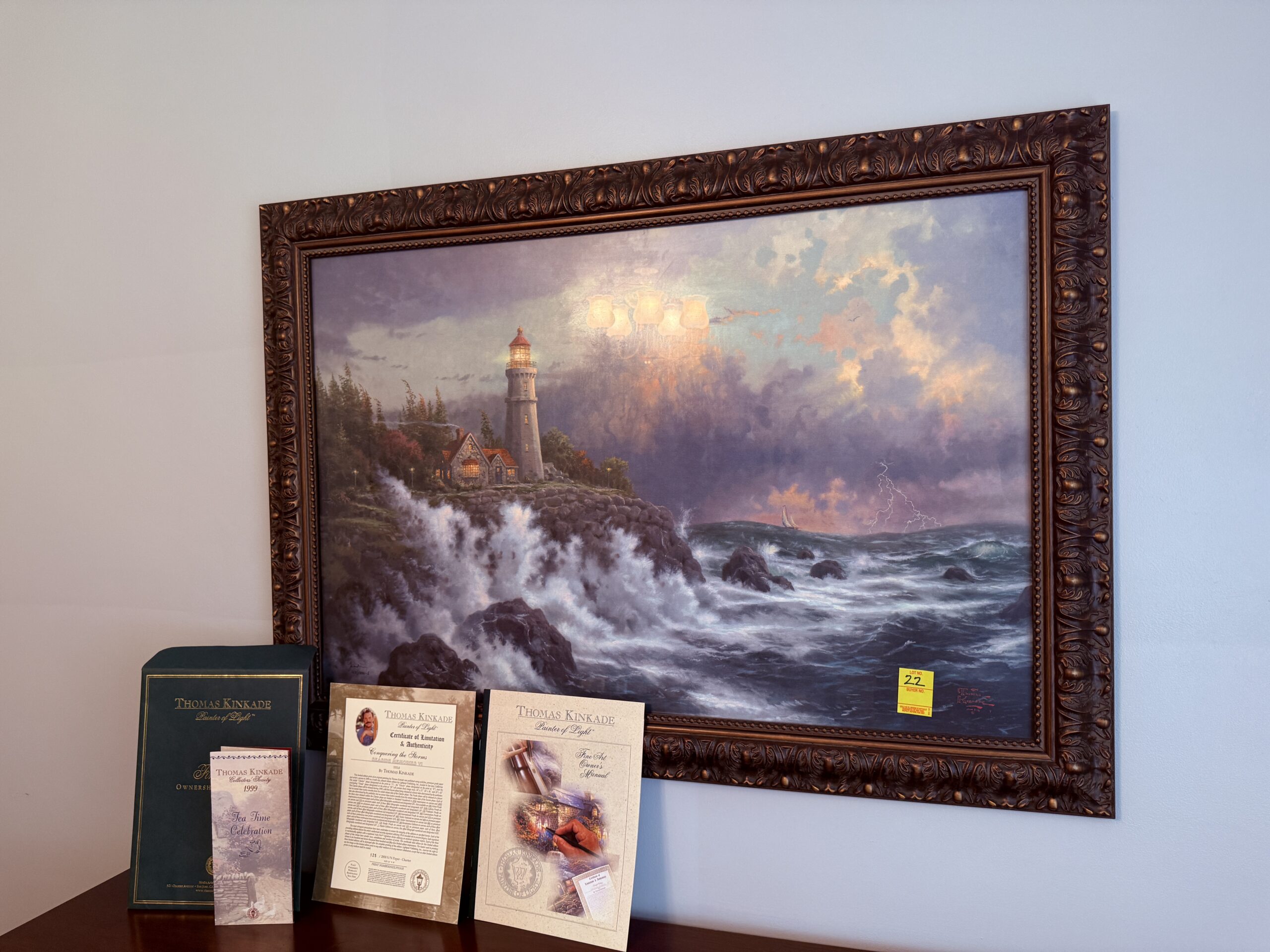 LOT 22. CERTIFIED THOMAS KINKADE FRAMED “CONQUERING THE STORMS” ART