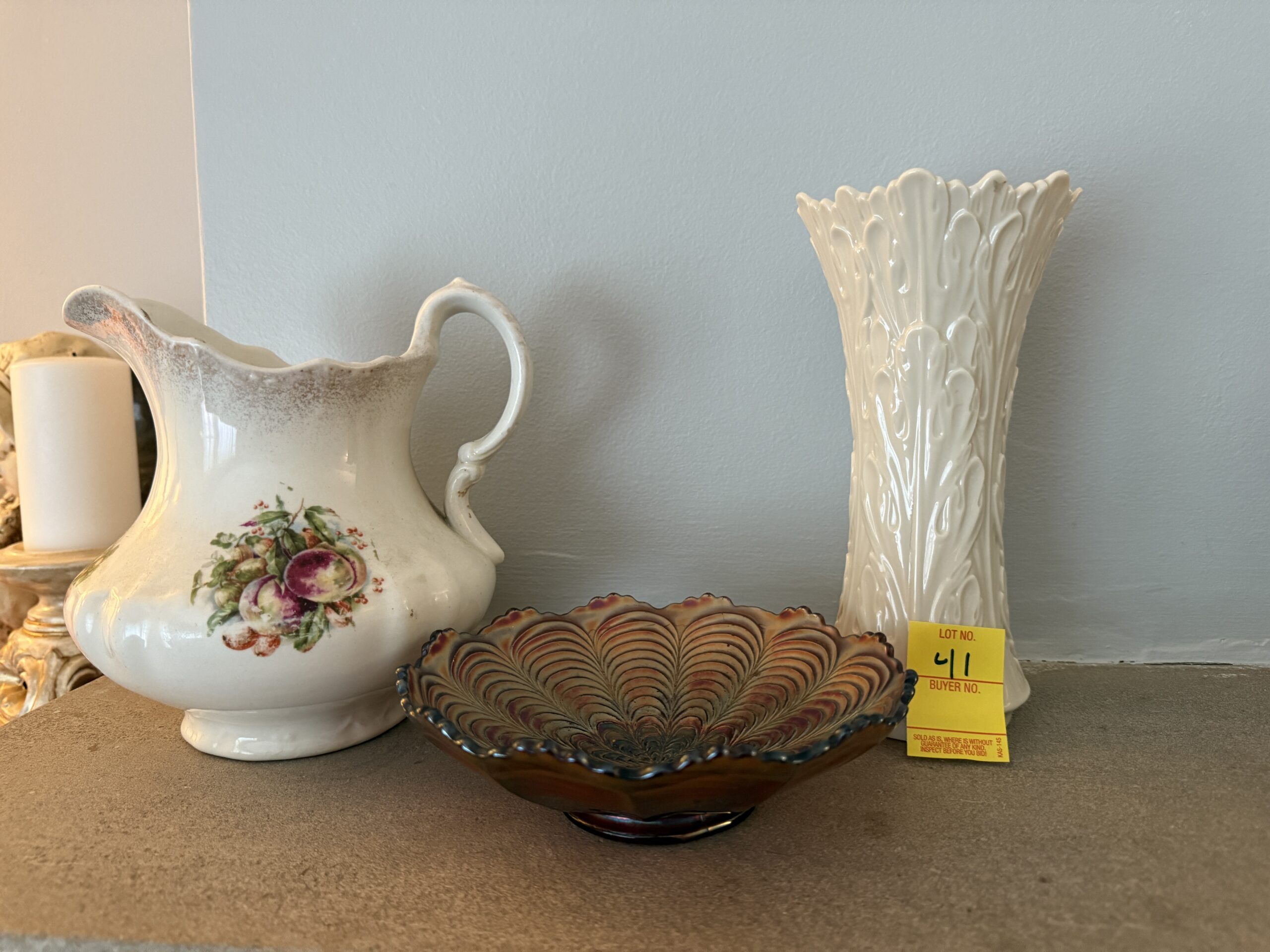 LOT 41. VINTAGE CARNIVAL GLASS DISH, VASE AND ANTIQUE WATER PICTURE